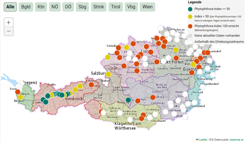 Während in der Frühkartoffel die Abschlussbehandlung erfolgt und die Ernte bevorsteht, ist in der Speise- und Industriekartoffel auch heuer wieder wetterbedingt eine frühe Erstbehandlung gegen Phythophthora zu setzen. Der regional teils starke Niederschlag hat auch zu Staunässe geführt, was Primärinfektionen über den wassergesättigten Boden begünstigt.  Das Infektionsrisiko wird landesweit als hoch eingestuft.