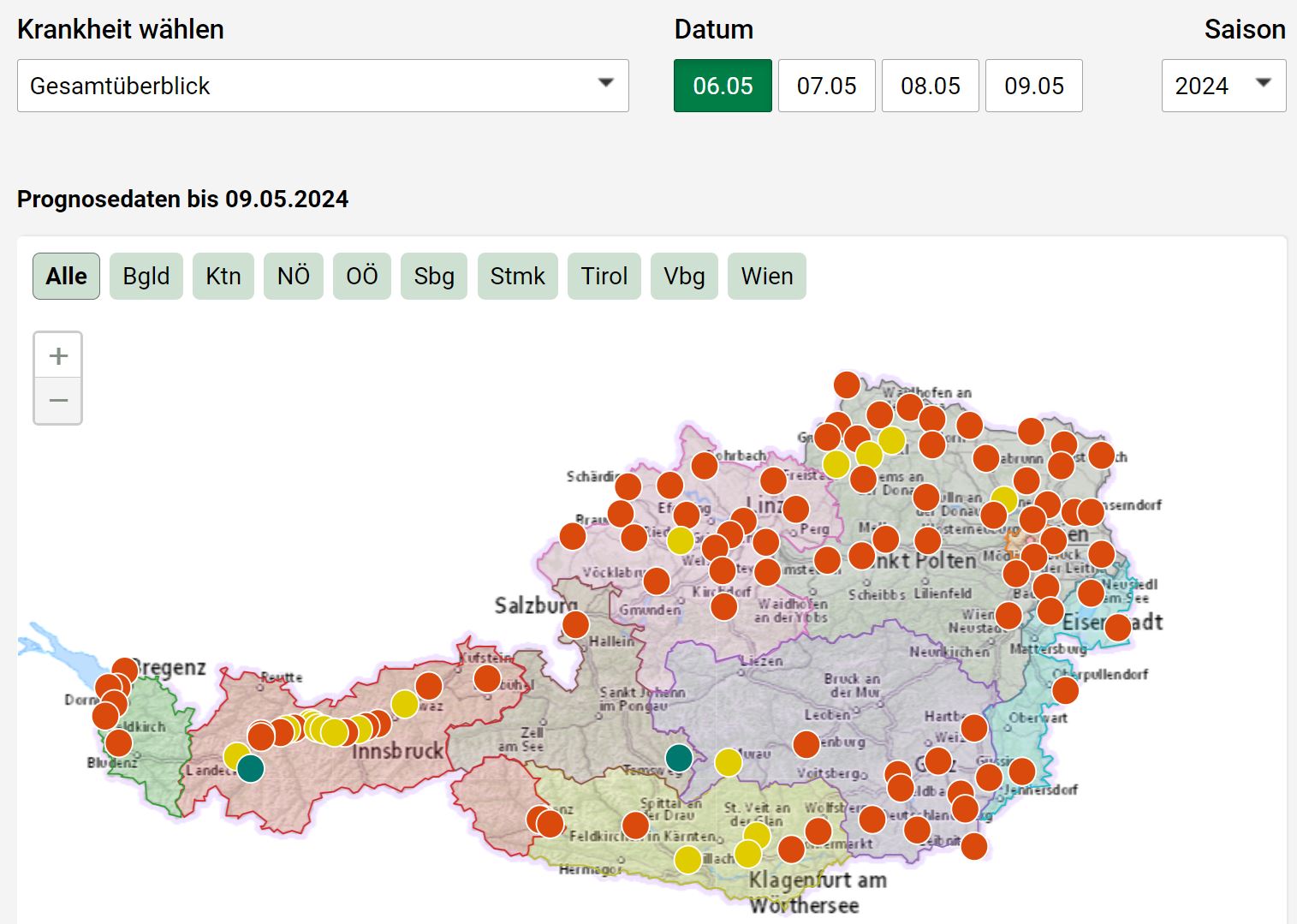 Hier finden Sie die aktuellen Infektionsprognosen für die wichtigsten Weizenkrankheiten.