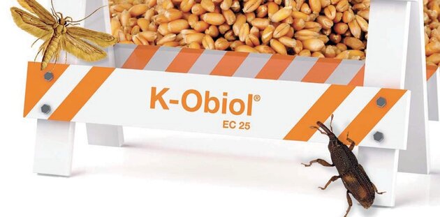 10 ml K-Obiol in 990 ml Wasser/Tonne Getreide 6 Monate Schutz 20 ml K-Obiol in 980 ml Wasser/Tonne Getreide 12 Monate Schutz |