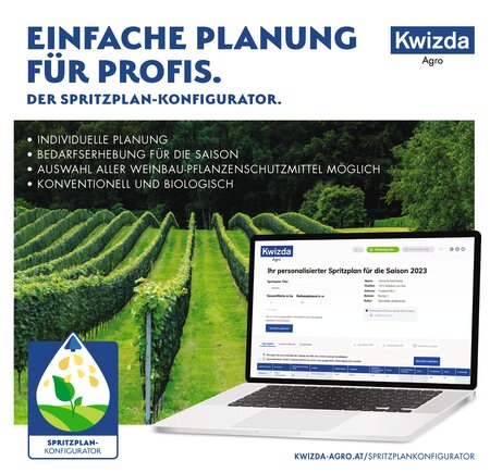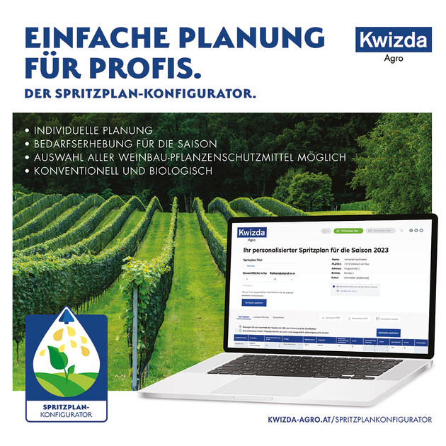 Der Kwizda Agro Spritzplan-Konfigurator steht kostenlos unter www.kwizda-agro.at/spritzplankonfigurator zur Verfügung und ist für den Weinbau ein innovatives und einzigartiges Service in Österreich.