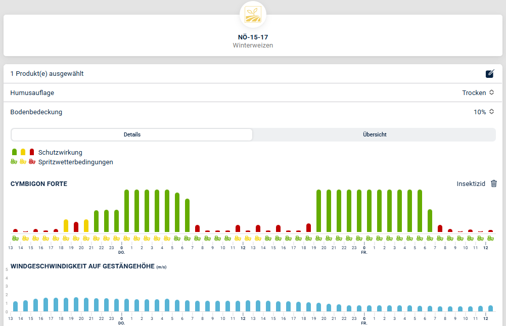 • Für Ihre Auswahl erhalten Sie eine Grafik mit den optimalen Anwendungsbedingungen in den nächsten 48 Stunden für die optimale Wirksamkeit