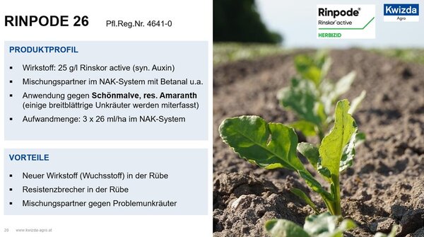 Rinpode 26 darf nur bei Auftreten der 2 angeführten Unkräuter eingesetzt werden und wurde daher nur für 1.800 ha Zuckerrübe genehmigt.